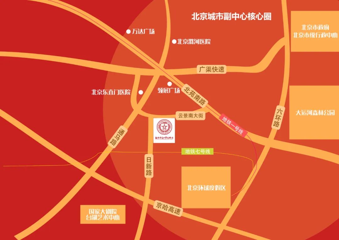 学校位于北京城市副中心核心地段通州梨园区域,地铁一号线、地铁七号线双线地铁交汇。学校毗邻国家大剧院台湖剧场、北京艺术中心、北京城市图书馆、北京大运河博物馆、北京大运河文化旅游景区、北京环球度假区,艺术氛围浓厚。