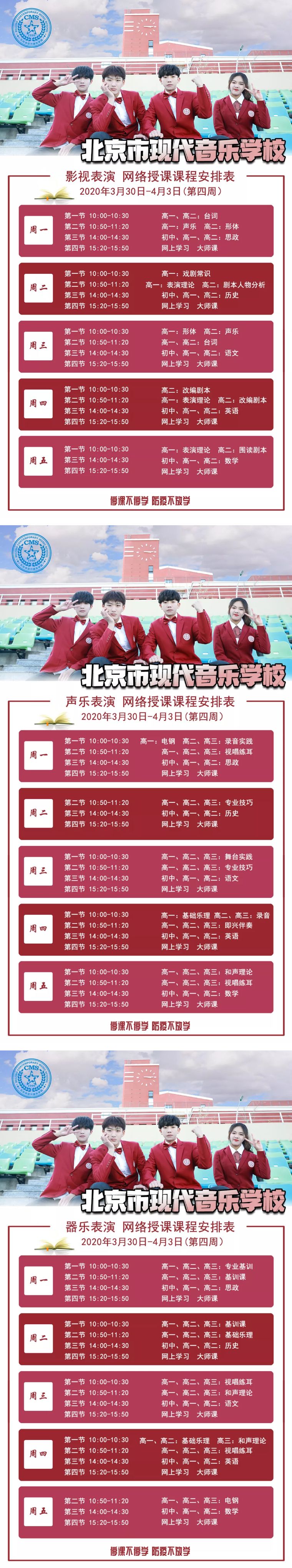 停课不停学,学习不延误!北京现代音乐研修学院及北音附中——北京市现代音乐学校第一阶段635节(大学339节,附中296门次)海量“网络云课程”教学计划自3月9日正式开启以来,日前已平稳推进三周,本文整理了接下来北京市现代音乐学校网络授课第四周(3月30日-4月3日)课程安排,以便师生查阅。